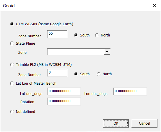 For Example: Lets assume we haveyou have a job in UTM coordinates and we are based in Australia. We know we are in zone55 and in the southern hemisphere. Click on File -> Geoid and make sure we have the following set: