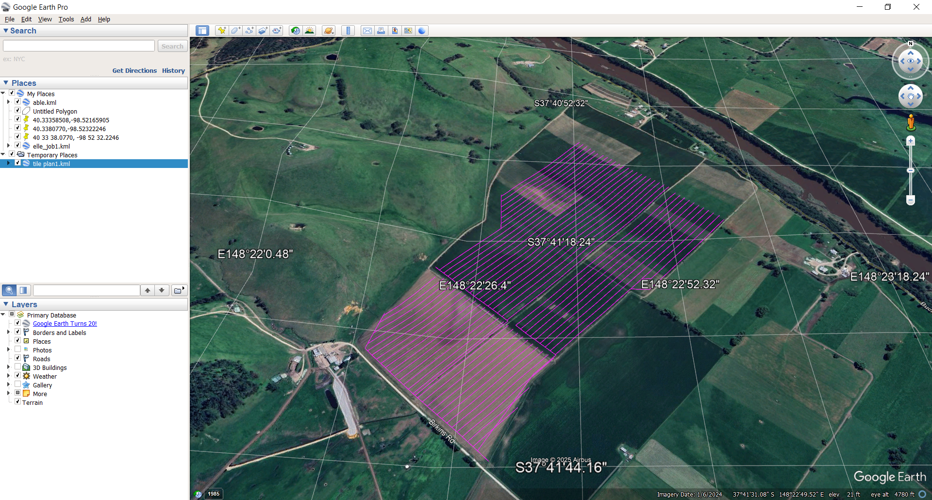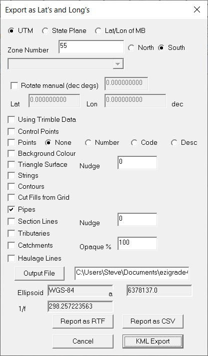 At this stage I often export to Google Earth to make sure we are georefenced properly. In thsi job I went Export -> Google Earth. Note that once we fill in the File -> Geoid dialog the coordinate system is filled in automatically.