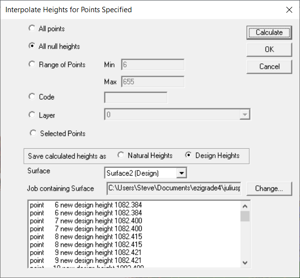 Check the calculated heights make sense. If a point is outside the design surface then a design height is not calculated. Once happy click on the OK button and the design heights are set.