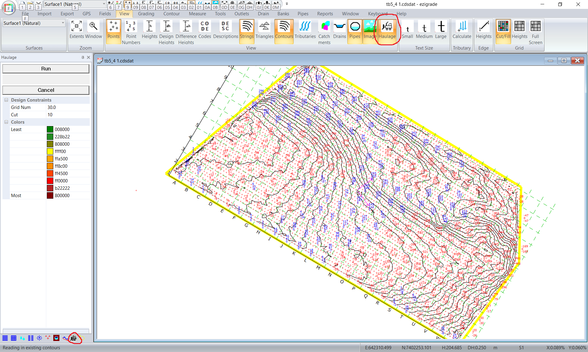 Before running this option run the grading. This way we have a natural, design and cut/fill surface. The arrows calculated are based on the cut/fill surface. To run the routine click on either the View -> Haulage option or click the Haulage docked window icon seen toward the bottom left.
