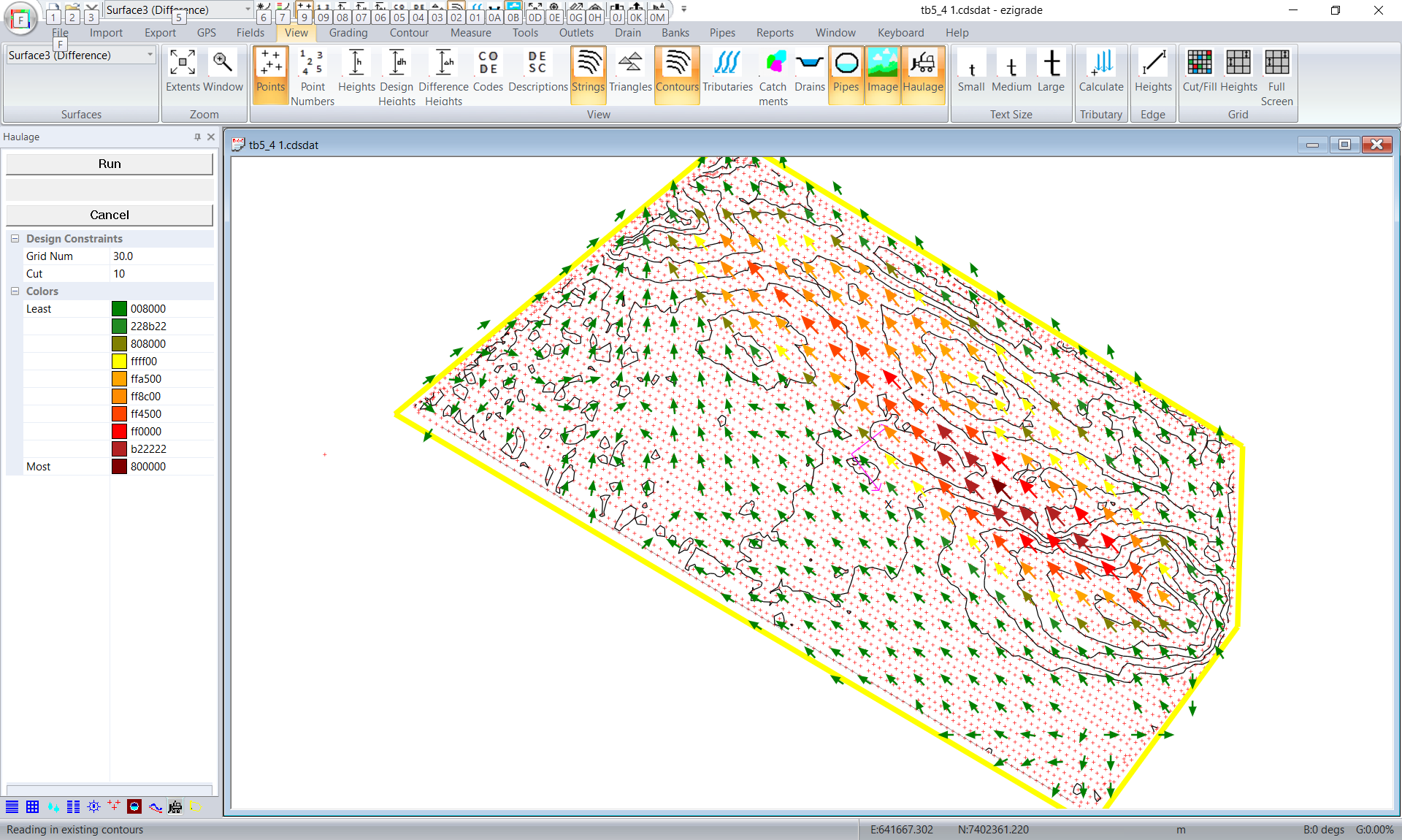 Ezigrade can display the best way to grade the field. This is done via color and size coded arrows that show the direction of earth movement. At present we don't quantify the actual haul volume via distance. This will be a further update.