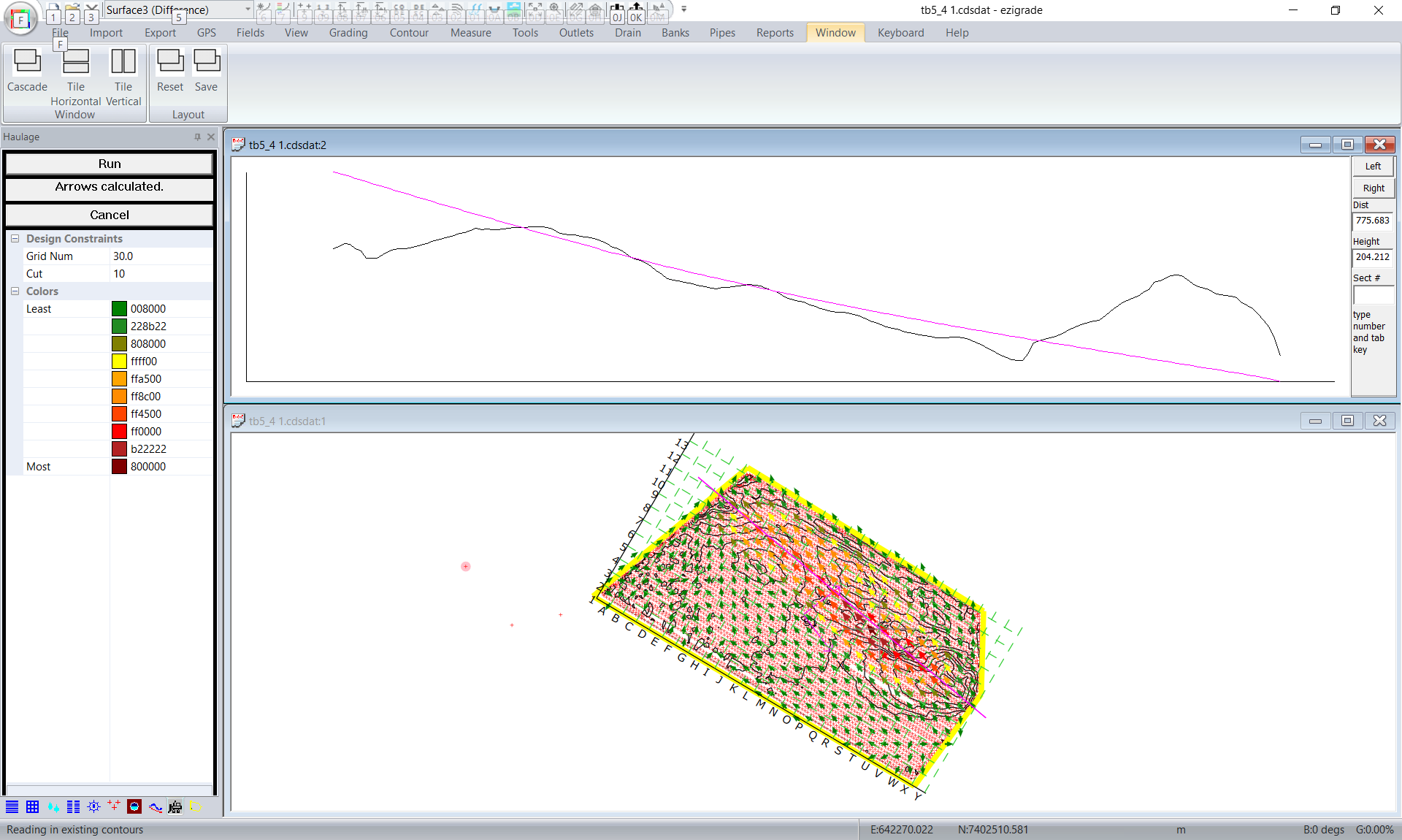 It is always a good idea to understand the job and understand why we are moving the dirt as we are. In Ezigrade click on Measure -> Define Section and click in a line from the north west to the mid east. Roughly along the line of the maximum earth movement. Now click on Measure -> Display and Window -> Tile Horizontal to emulate what we have below. You can see the new design in purple and the existing surface in black. You can see how we need to move all the dirt from the west towards the east which corresponds to the arrows in the plan view above. THe middle of the job is showing a large amount of dirt movement as we need to cart all the way from east to west and the dirt travels across this area without doing much in the middle.