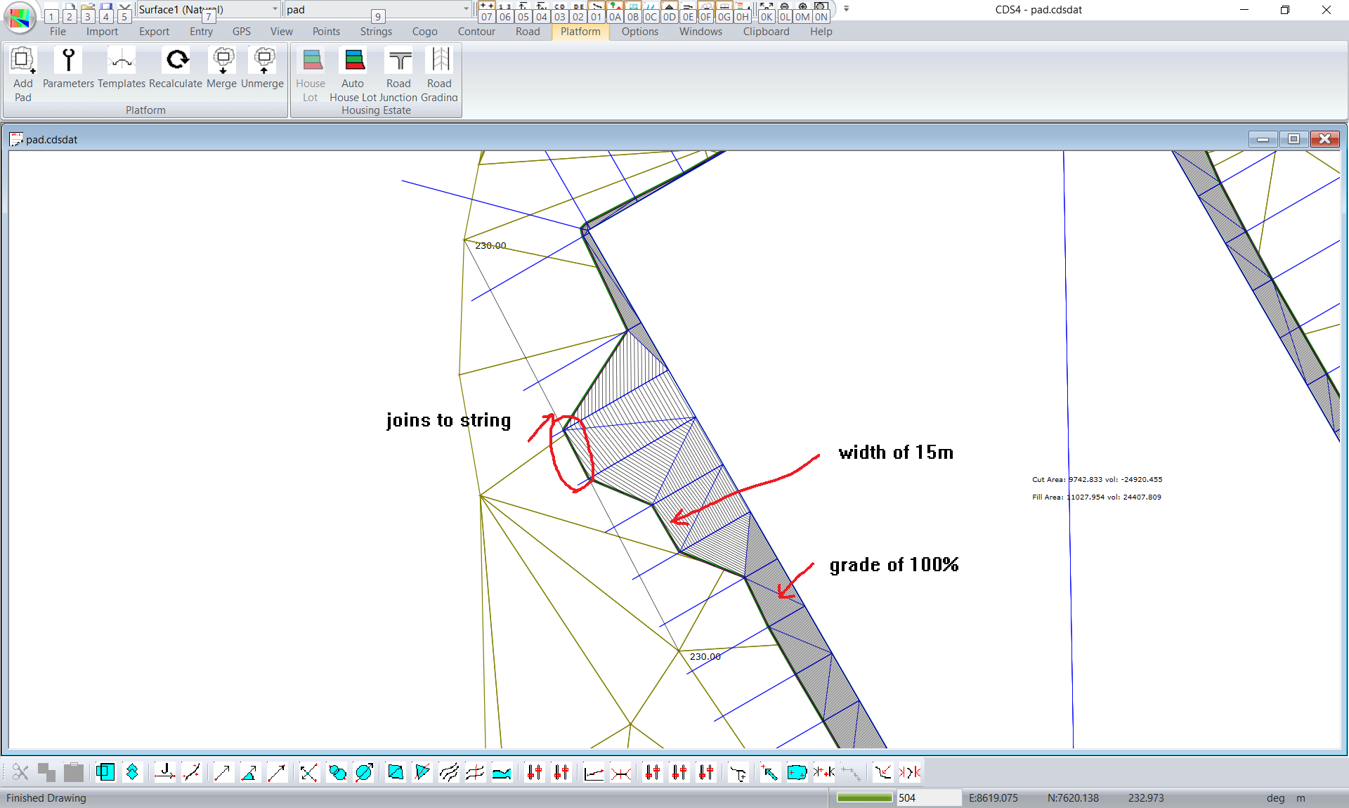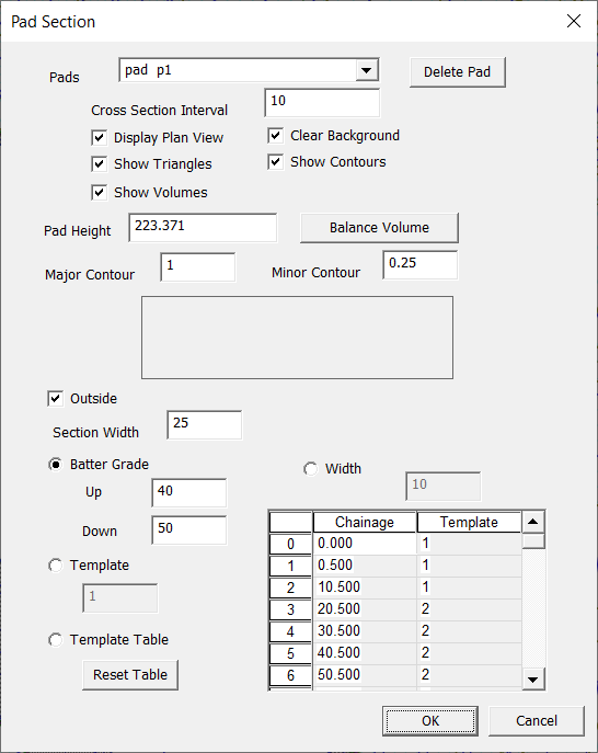 Lets say we wanted something a bit more complicated. Lets say we wanted to put a bench in the batter slope if we have a batter slope that is too deep. We can use the third option and selet the "template" option and lets use template 1. The templates used in the pad design are exactly the same as those used for road design. So you can certainly watch the road design videos as well as the road design documentation. To design our template click on Platform -> Templates.