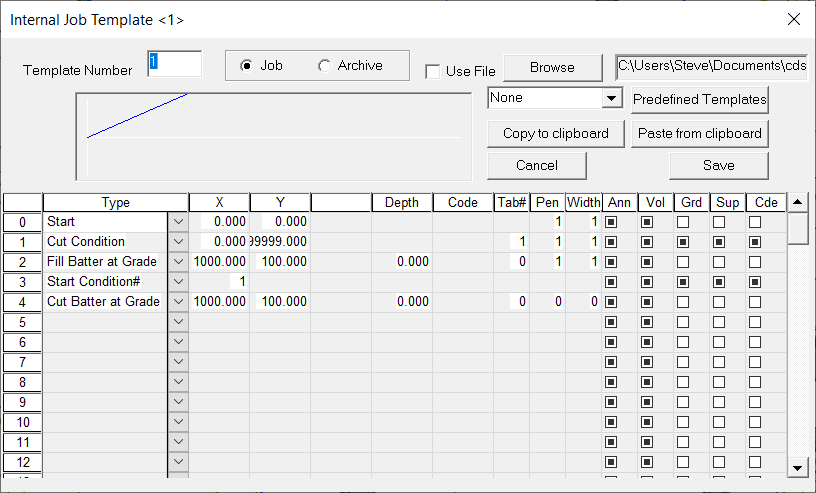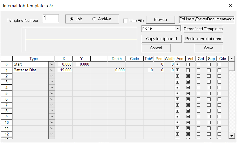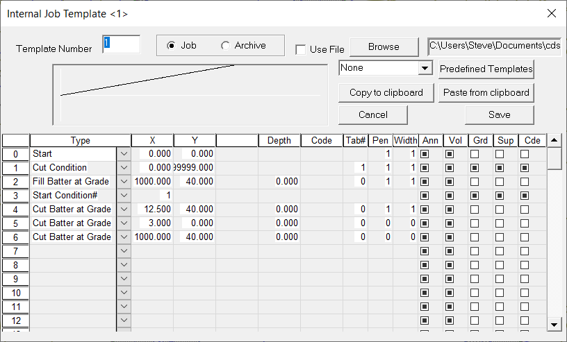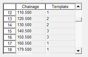 For greater flexibility again click on the "Template Table" option and hit the "reset table" button. We have a list of the chainages and a default template of template number 1. In this case we can duplicate the previous option. However we now have the versatility to use different templates at different positions. In this case we have used 3 templates.