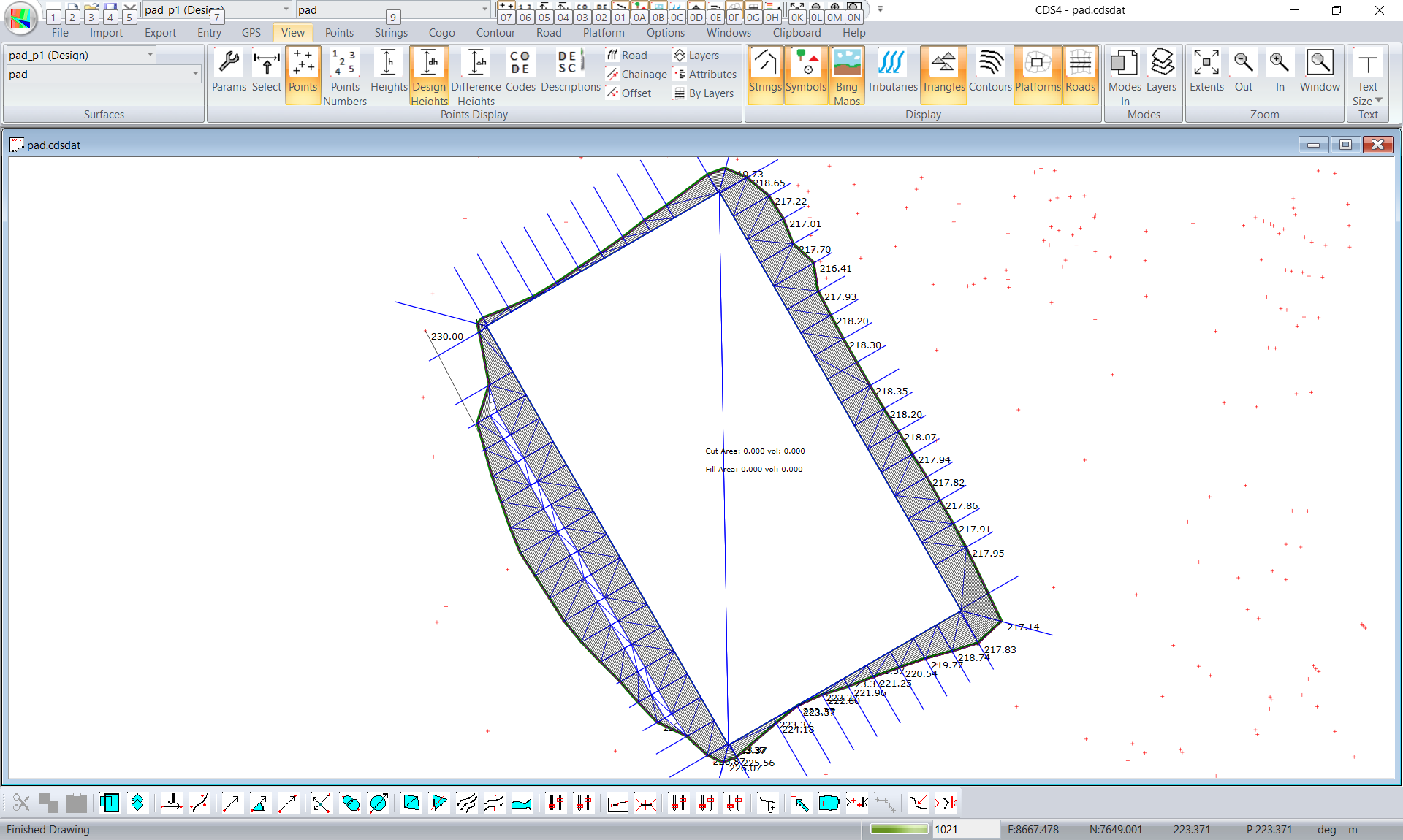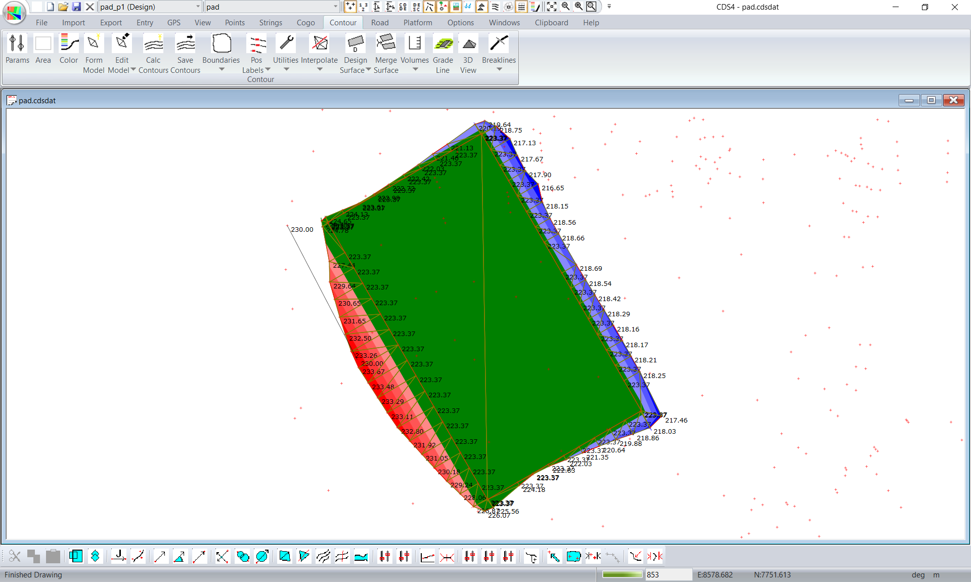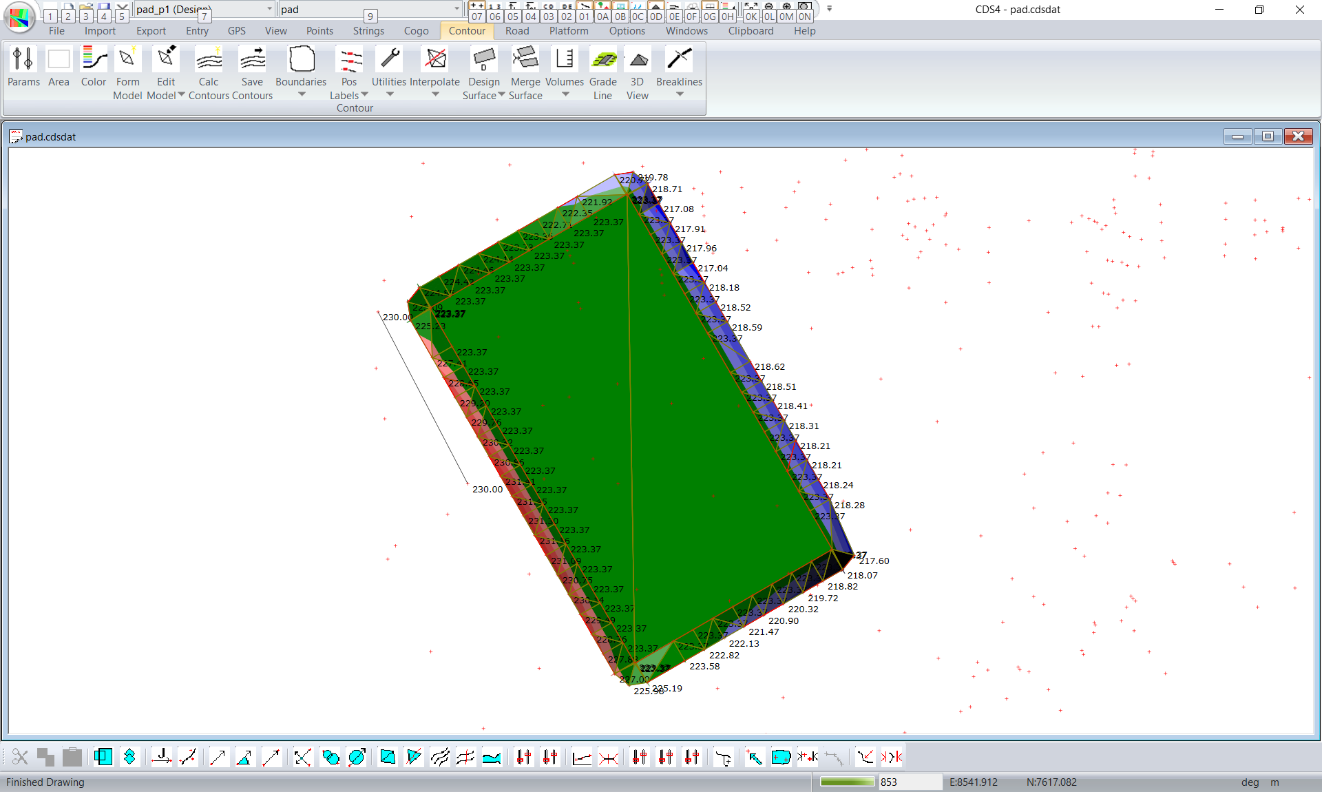 If you look at the bottom of the dialog you can see there are a number of different options to control the batter slopes around the edge of the pad. If you select the "batter grade" option we simply slope towards the natural surface and have a surface such as this: