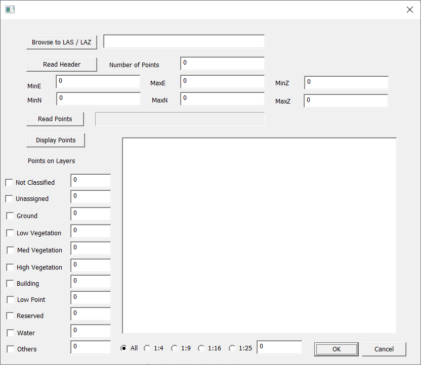 First click on "browse to LAS / LAZ" and select the file to import. Click on "read header" and then "read points". We have then pressed on "display points".