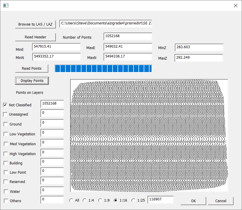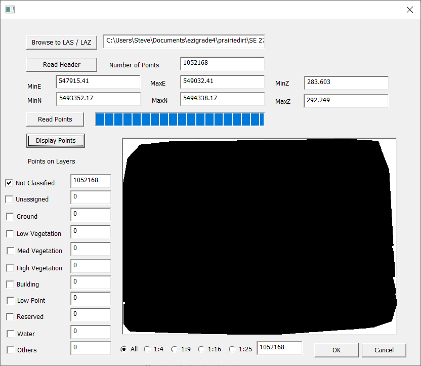 In this case we have over a million points and the points displayed make a solid contiguous blob. We could at this stage click OK and then import the points into Ezigrade. Ezigrade can handle a million point job but things will be very slow. At this stage you need to decide what you need to do with the data. If you want to use the lidar data as a guide for land grading then we need less points.