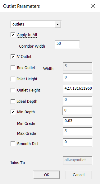 We have decided to use a V outlet . We also want to match the design surface. This is the child outlet that joins into another. It automatically creates an outlet height so things match. Tick "apply to all" and press OK. Otherwise you can design the parameters separately for each outlet.