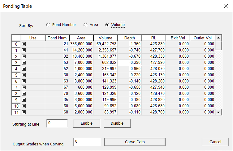There are 88 individual ponding areas. A lot of these are trivial so we want to ignore them. Looking at the ponding surface I would suggest that 10 of the ponds are worth draining. The rest can be ignored. So I put in 10 to the "starting at line" and clicked disable.