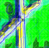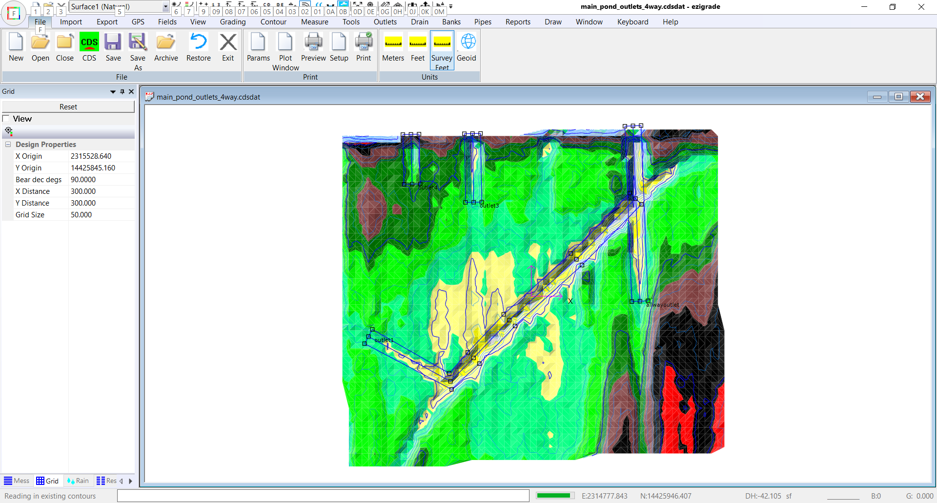 I now click on the "Carve Exits" button and the dialog will exit. When the screen is redrawn we are shown the deepest part of the pond areas by a red circle and a green line showing the minimum carving path.