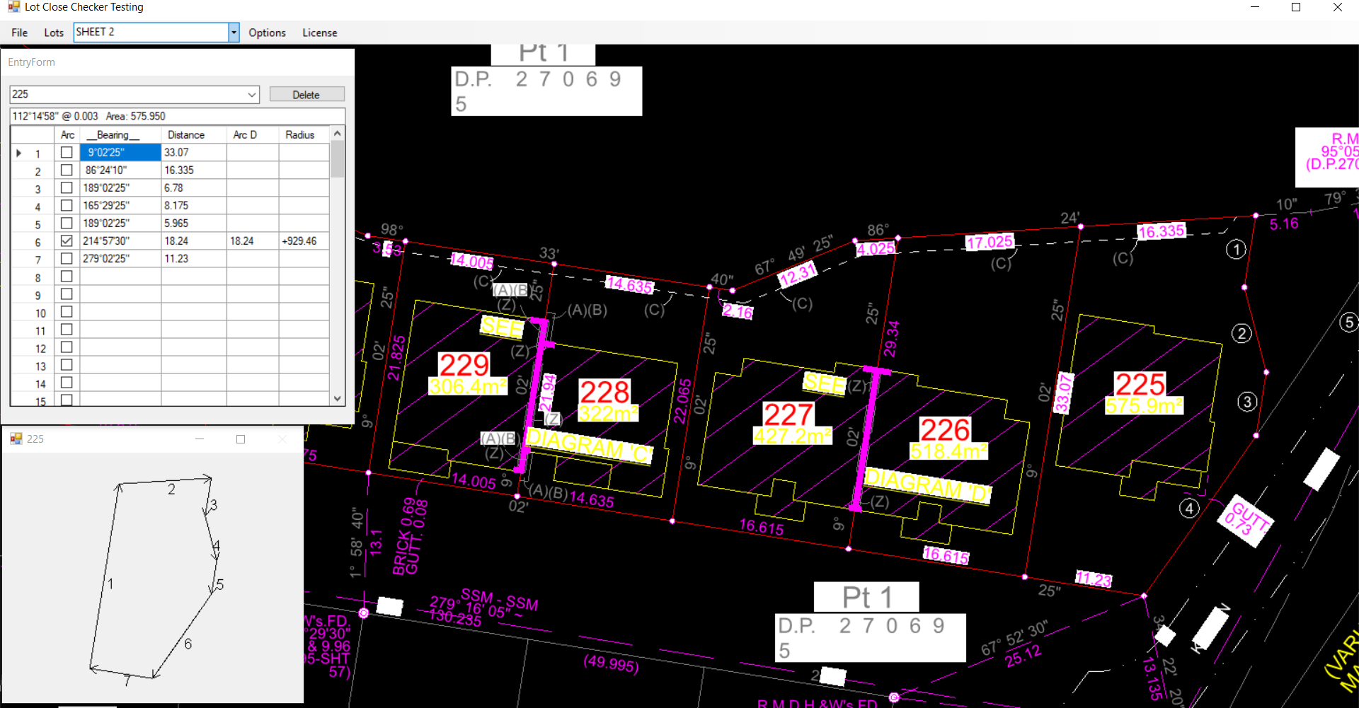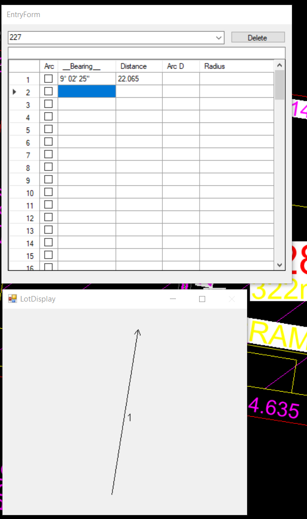 If we have an arc that is shallow then the "LotDisplay" will ask whether you are reversing the chord bearing or reversing the arc. Here is how we would enter Lot225 in the drawing below. Please note that we have clicked in some of the values from the short line and arc table.