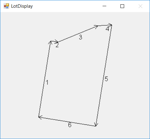 You can type c at anytime any the area, misclose distance and bearing are displayed. However when you do this we have an obvious problem. The LotDisplay dialog also shows an issue. You can see that line 5 is obviously heading in the wrong direction. When we clicked in these values we are assuming that we entered in a clockwise direction. So line 5 should be heading down the page. However the bearing shown is assuming we are looking up the page.