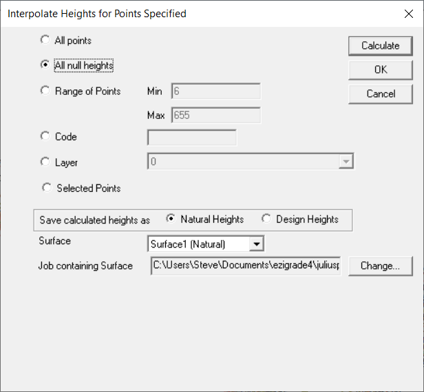 However we often have a job with a natural surface using points only with a natural surface height set; and a design surface where only the design heights are set. In this case we have 3 options.