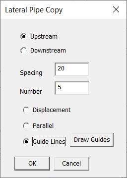 And click on the "Draw Guides". The dialog disappears and you can click in a guide line. Draw the guide line so that it passes close to a node in the original line. The subsequent copied lines use this guide as guide to where to place the new nodes.