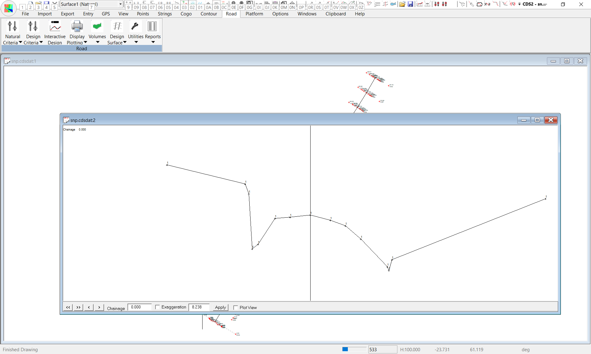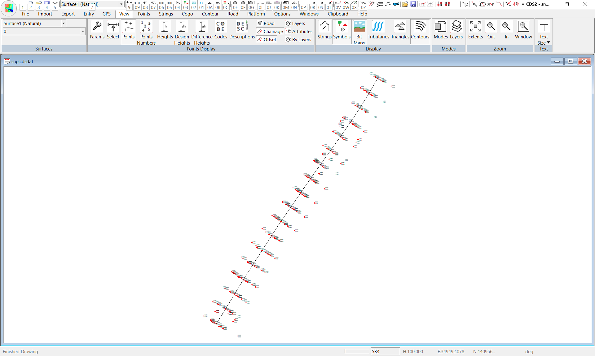 In this case the field surveyor actually marked the centreline every 20 metres, and then took cross sections at those marks, so the sections are quite regular.The Centreline points have been joined together by a String with an ID of CL which is in the Folder LOTS.