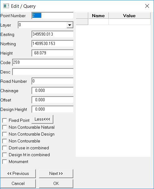 For this to happen, each point must have a chainage and offset, and if a cross section is to be presented, there must be at least two points with exactly the same chainage.If you press the “?” key to do a Query on the points in the job, you will find that the first point presented is Point 2, and inspection will show that there are zero values for Chainage and Offset as seen at right.