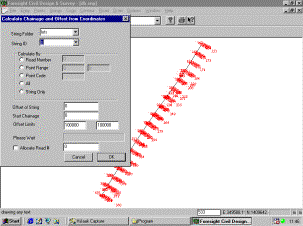 Once all these fields have been completed as described, you should select the OK button, and you will see the “Please Wait” bar flash as the calculations take place, and you will now be returned to the Road Window. At this stage it is wise to check that things have worked, so do a Query on Point 2 by pressing the ‘?’. You will see that is now has values for chainage and offset and it is on Road 1. You can use the Next and Previous buttons to check on other points if you wish.If you Press Z for zoom, followed by E for Extents, you will now see points appear within the roadworks window as seen at left.