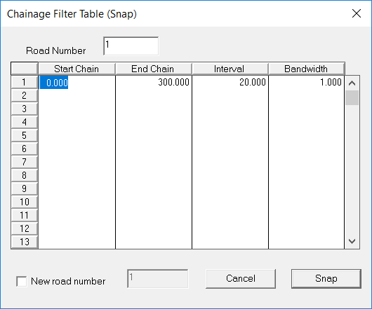 If you pull down the Road menu, highlight Natural Criteria, and Select Chainage Filter, as screen will appear as seen below.