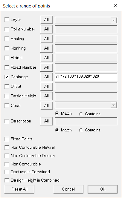 A screen will appear as seen at rightYou need to select the Check Box for chainage, and in the field type in 71~72,108~109,328~329 to indicate you wish to select all points in the range of chainages which we no longer wish to appear on Road 1.