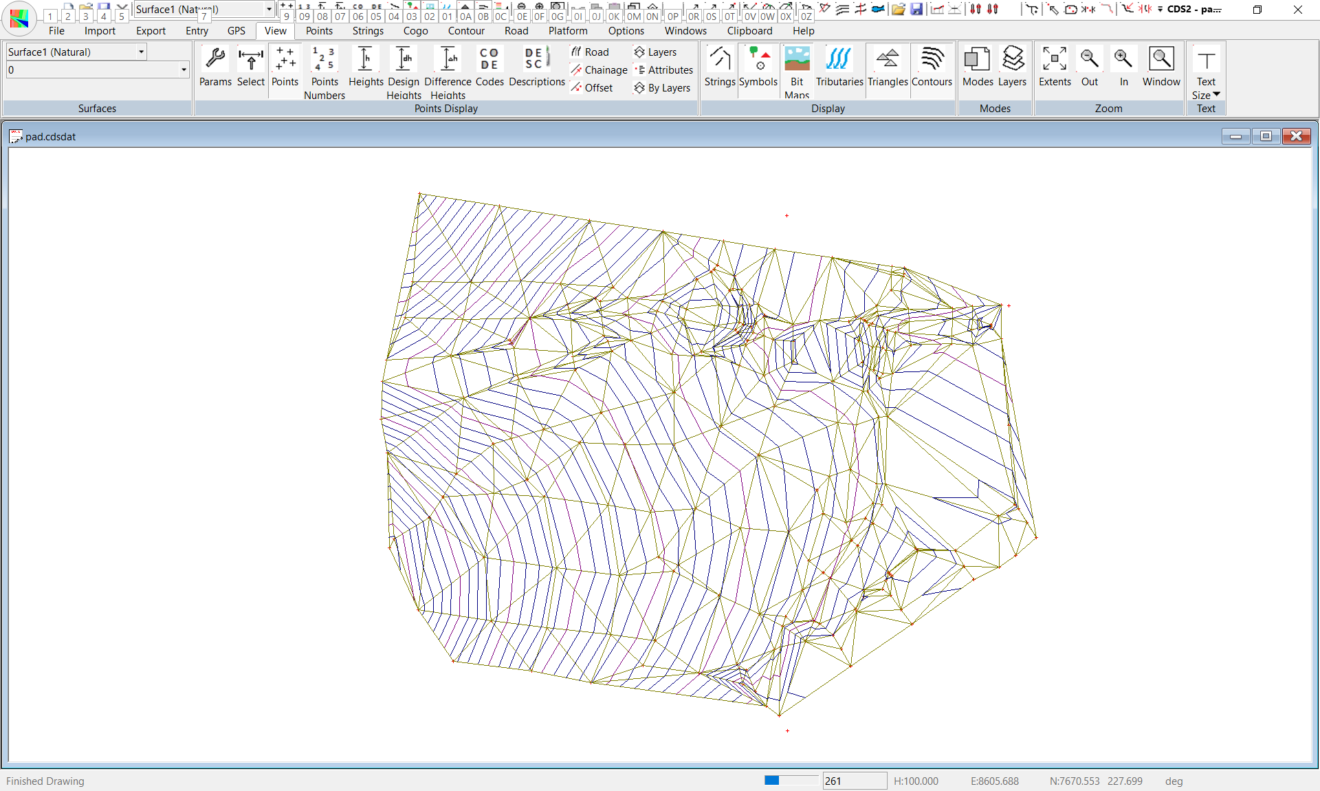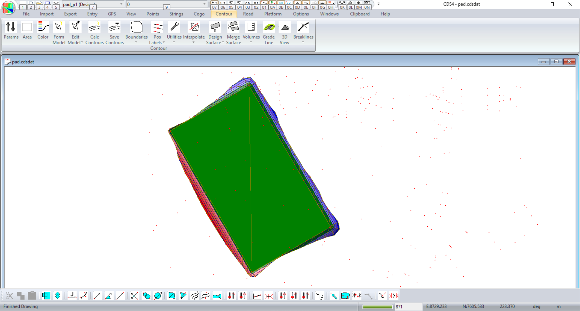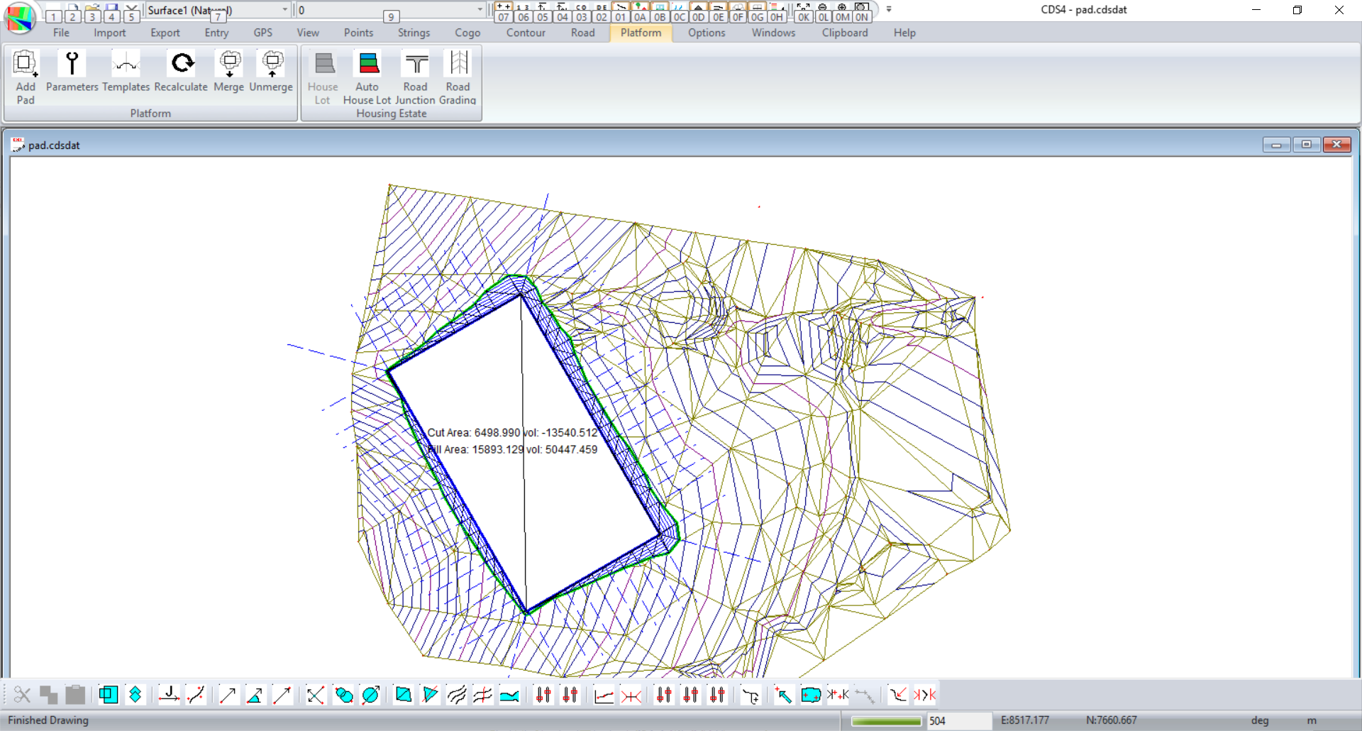 Once you are happy with the design then click on Platform -> Merge. A new triangular surface is created. You should turn off the platform display. Look under the View menu and you can see the "Platforms" icon. If you change to the new surface you can display contours, height displays etc.