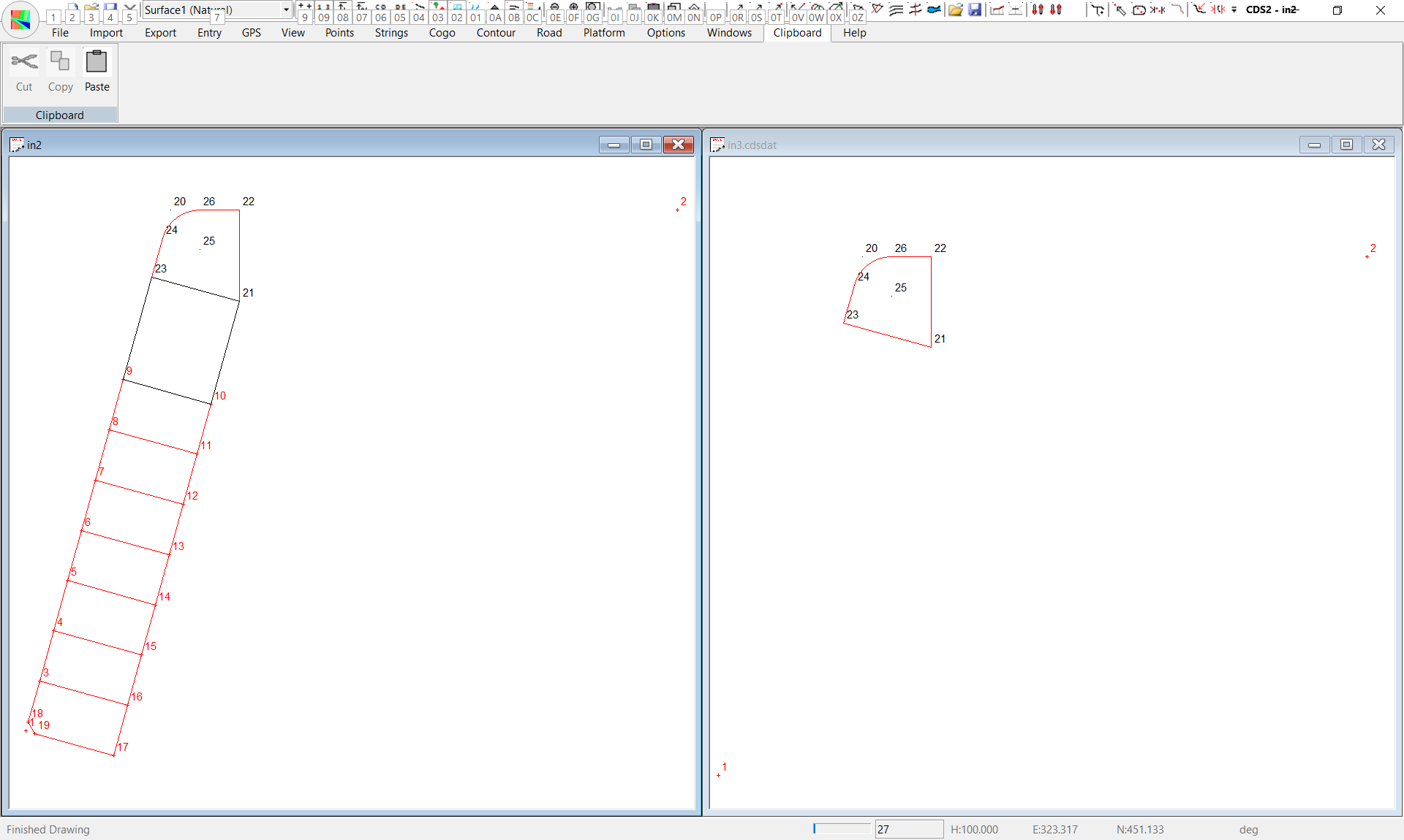 To get the points into it you need to use the Paste function. Click on the Clipboard menu and you will see that the paste option is available because there is data on the clipboard. If you select Paste, the points will now be placed into Job IN3, and if you then Zoom Extents, you should see a screen like that at right.