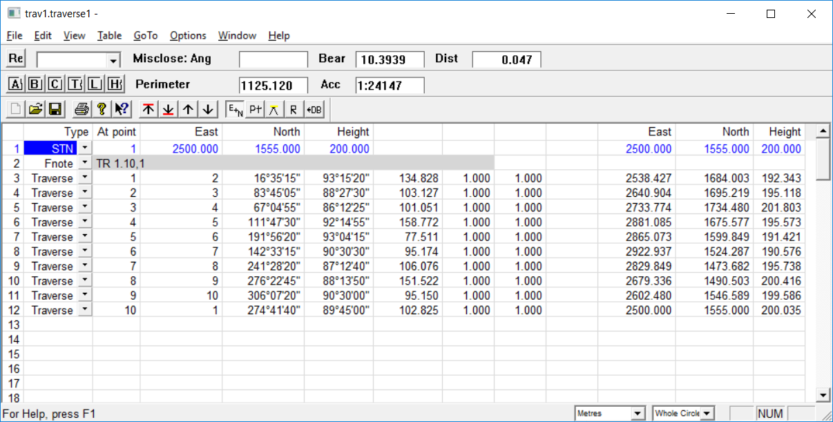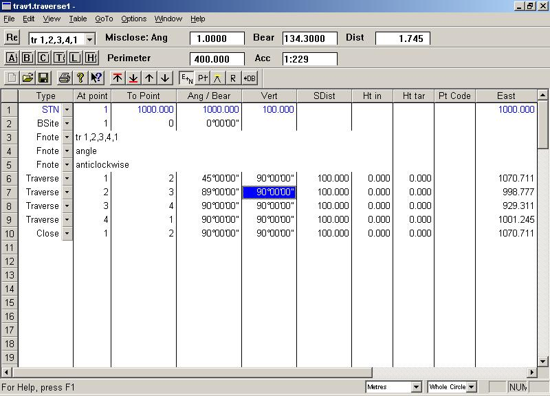 Obviously in your real life work, you will need to enter in the values that you measure for both height of instrument and height of target if you are to obtain correct values for the heights of the stations. Enter 1 for both height values, and press Enter to skip over the Point Code column, and you will see the cursor appears on the next line offering a default type of Traverse. Press Enter to accept it, and then continue to enter the data shown in the table until you reach the end, by which time you should have a screen as below: