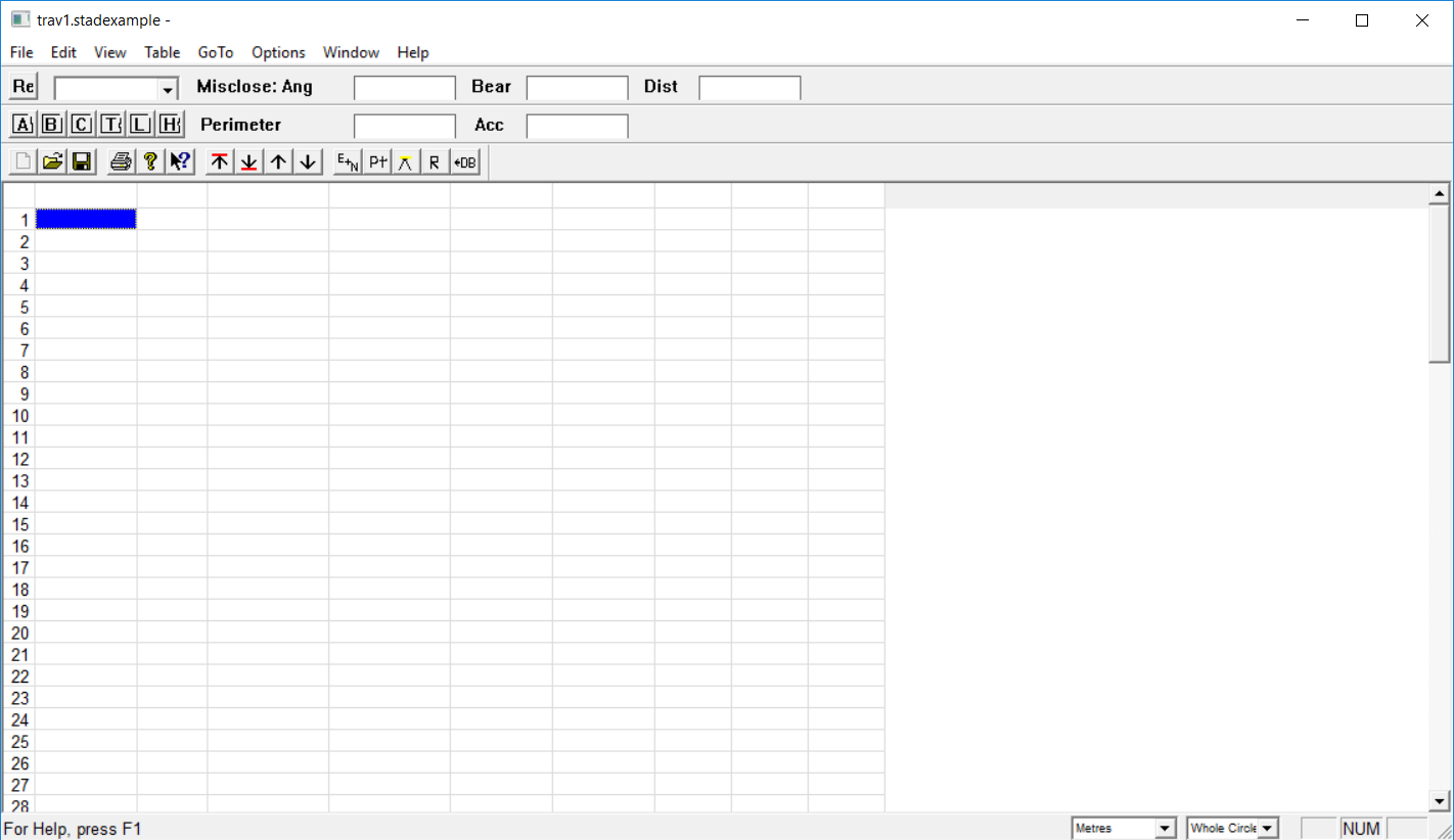 The screen will appear similar to that below left. Since this is a new job, select the New option, and then maximise the screen so it appears as above right At this stage you need to be aware that traverses are broken into two main groups, defined by how the horizontal angular measurement has been observed and recorded. The two are "horizontal bearings" and "horizontal angles".