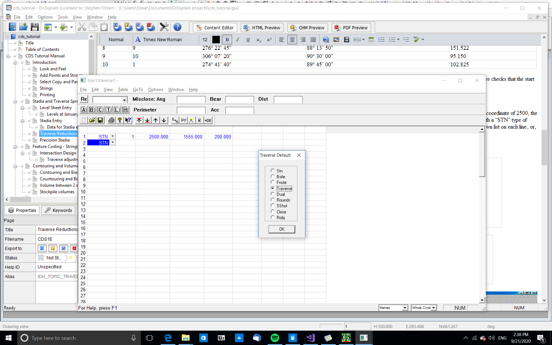 Open a new CDS job and call it stringtraverse. Enter in the start point / station point of 1. We have used coordinates of 1000.0,1000.0 with a height of 10.0. We have used the Cogo funtion, calculate will s a temFrom Windows, select the Start button, and then select Programs to see the list of available programs Pull down the File menu and select New. Enter a Filename of trv, and a Description of Traverse Tutorial, then select Open, and a blank screen will appear. Access the Traverse Entry Screen Use your mouse to select Entry from the options on the menu, and then select Traverse Network.