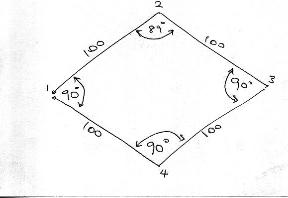 To calculate the angular misclose press the "Re" button. A misclose value of 1 degree will be shown. Pressing the "A" icon will distribute this misclose equally around the traverse. In this case the 89 degree angle is replaced with 89~15' and the 90 degree angle is replaced with 90~15'.