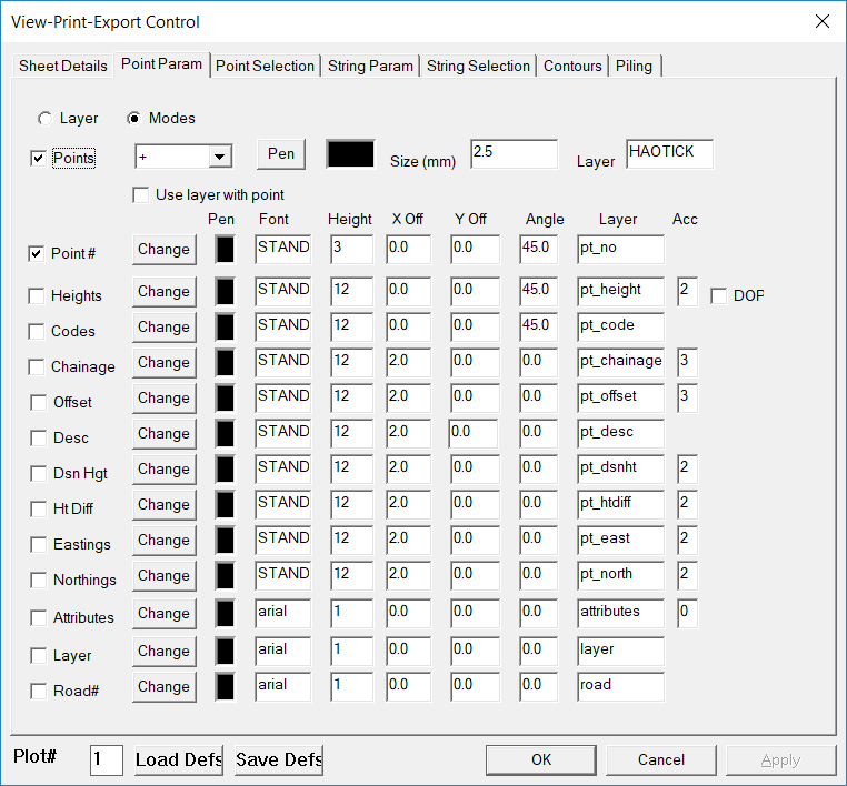 If you are only plotting 1 piece of text then the default will be fine, but if you wish to plot two pieces of information e.g. point number and height, you need to fill in the ” Yoff” column to indicate where you want the second piece positioned.