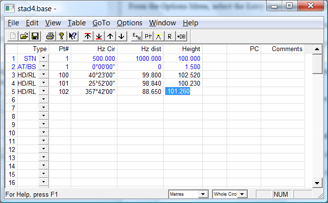 Now that you have specified the Station coordinates to be used, and the details of your Setup, it is time to commence entering the detail shots. From the field notes supplied you can see that these have all come from an electronic instrument which can reduce the raw readings and record a horizontal distance and a reduced level.