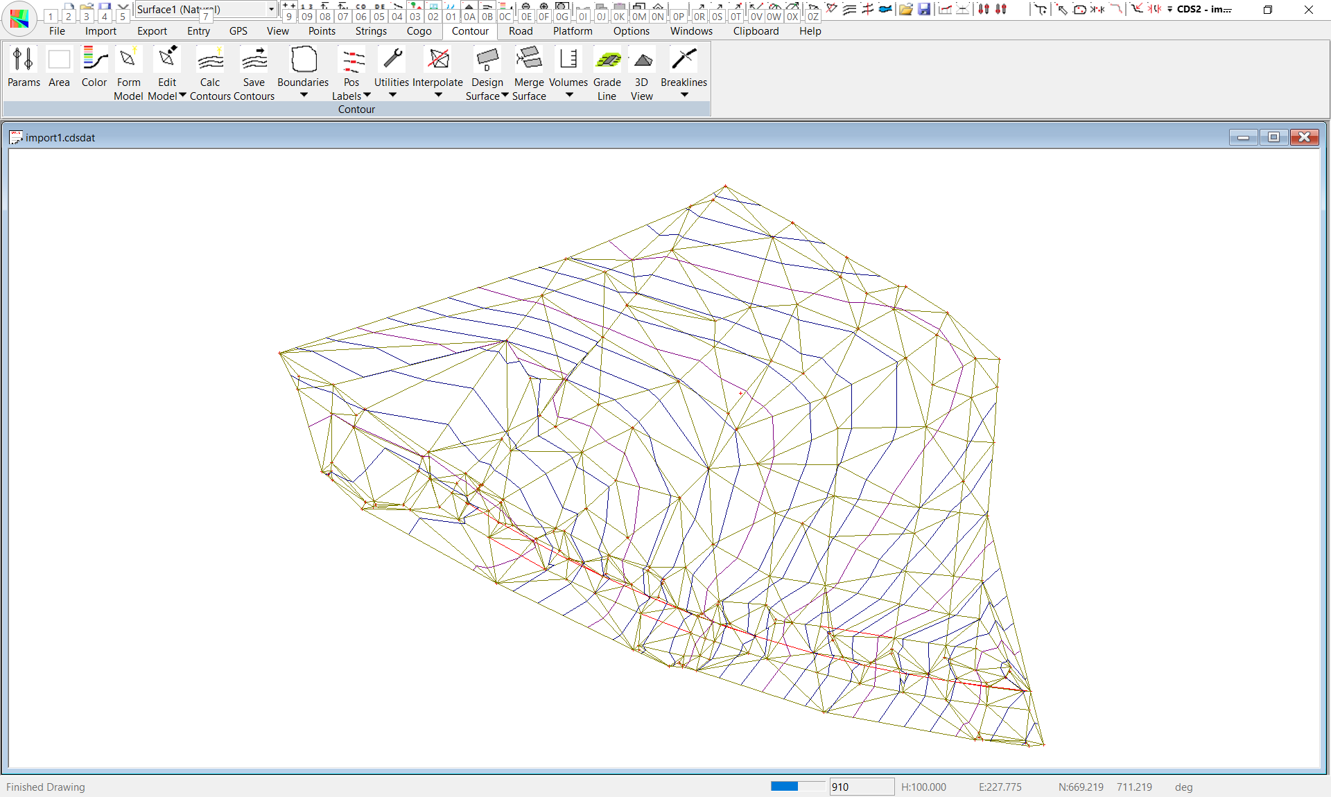 Pull down the Contour menu, Select Surface parameters and rest to pick up the extents of the job. Now change the Major Contour interval to 2 metres, and the Minor Interval to 0.5.