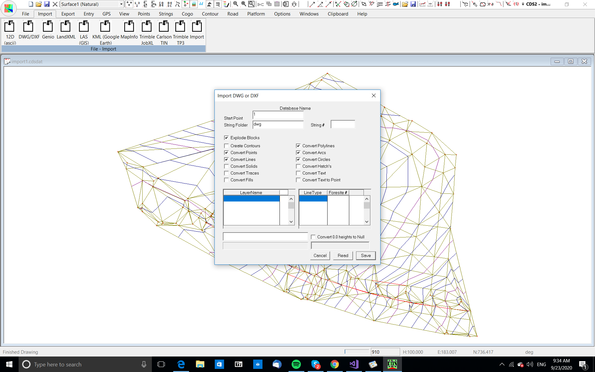Please NOTE that it is important to try and ‘control’ this information at the CAD stage if you possibly can, because it can save you hours of subsequent ‘sorting out’. It is usual for the architect or engineer who is doing the overall design to have a reasonably complicated drawing with all manner of things shown, including underground utilities, internal walls in buildings, overhead power lines, and fanciful landscaping, not to mention wonderfully ornate borders and title blocks. It is also usual that you are really only interested in bringing a few of these things into CDS. If the CAD operator has placed different things on different layers, then it can make your task simple if you can ask the CAD operator to turn off or freeze all the layers that do not interest you. Even better to get the CAD operator to actually ‘extract’ or copy the layers that do interest you into a separate drawing, and then simply give you that ‘smaller’ drawing to process. I should also warn you that because of the way in which CAD packages construct polylines, it is quite common for you to get double the number of points which you actually need when the data arrives into CDS.