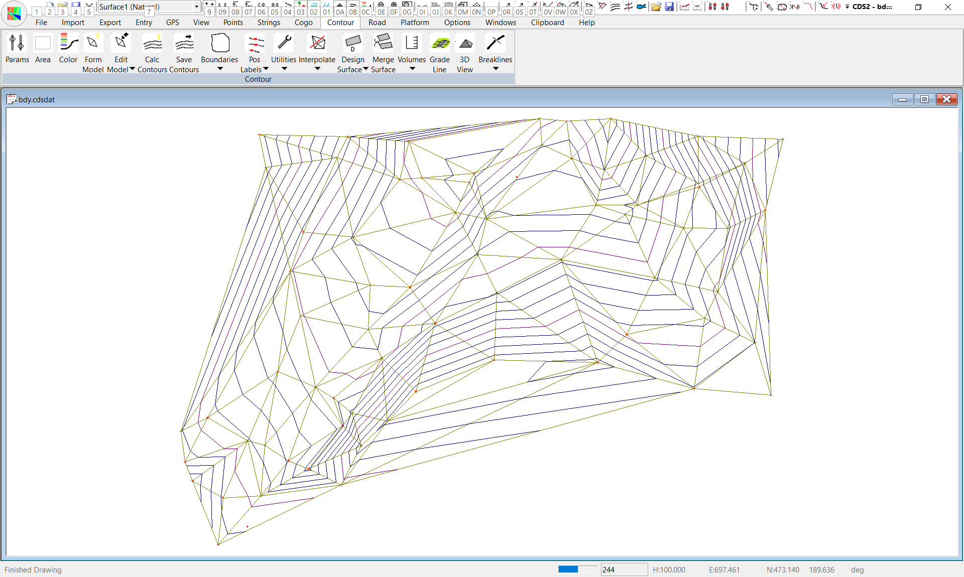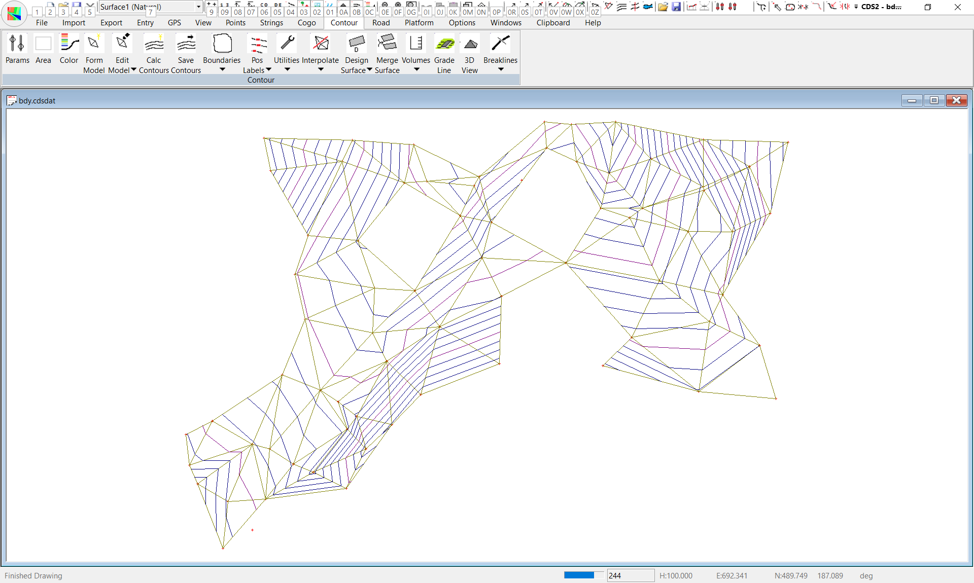 At this point the screen at right should appear, with the boundaries displayed. (If the triangles are in your way use the F8 key to turn them off).If you now turn your contours on, (with the F7 key) the screen as to the right.