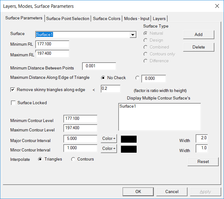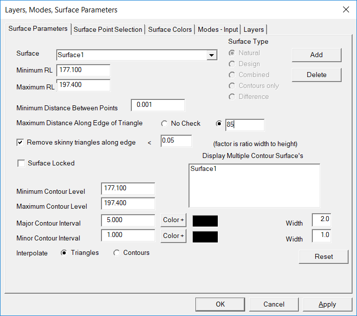 Now select Contour, then Surface Parameters and select reset to make sure the program reads the full extent of heights in the job. Set the Major Contour interval to 2 and the Minor Interval to 0.5.Also reset the Surface Point Selection to use all the points in the job.
