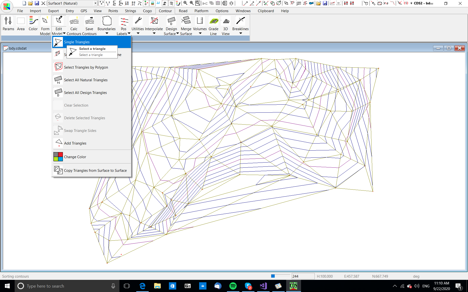 Now that you have the triangles reformed to their default state, we will look at how you can manually select triangles and have them deleted. Pull down the Contour Menu, and select the Edit Model option.