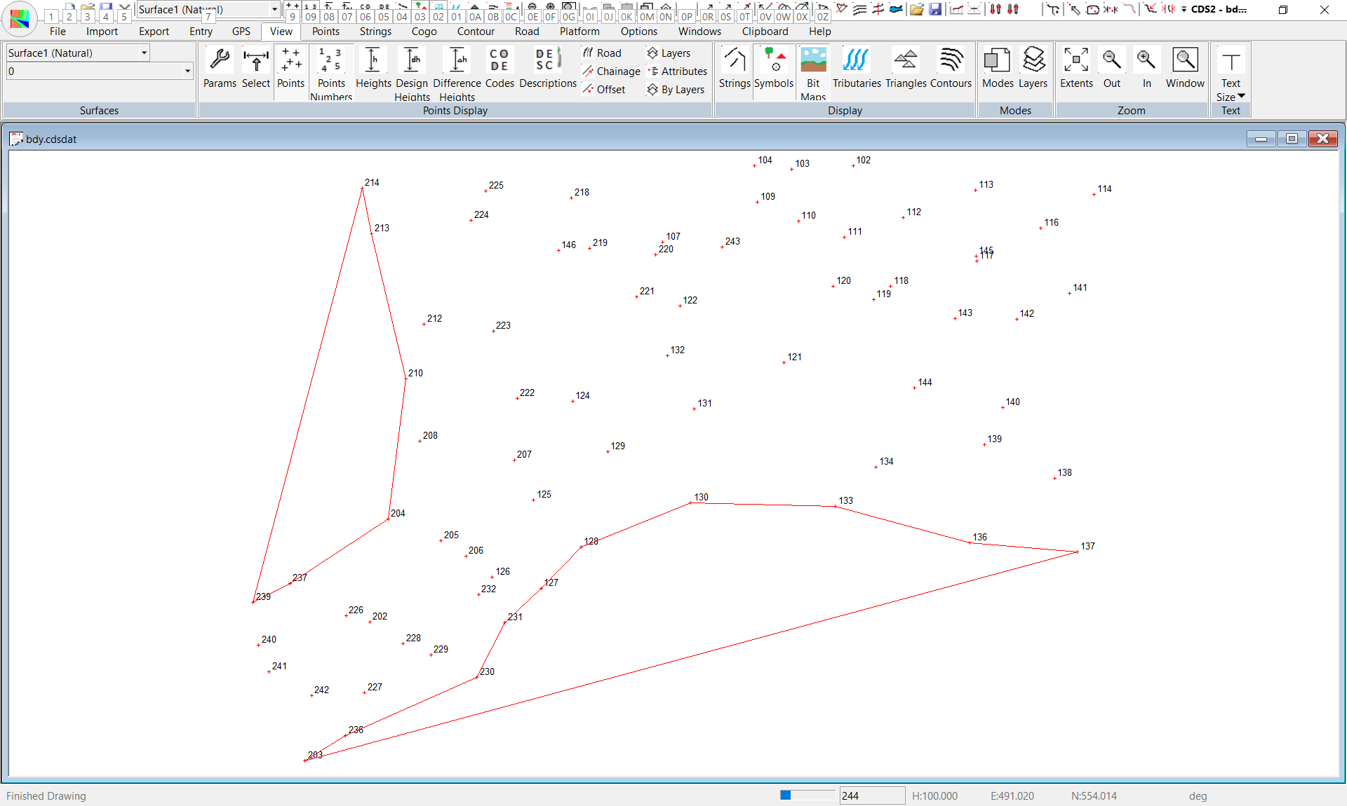 For example on the southern area of the job, there is a run of points around a ‘curve’ from point 230, through 130 and up to 137, and these points are in fact around the boundary of the particular parcel of land.Likewise, on the eastern boundary there is another ‘curved” run of points from 239 in to 204 and up to 214, and these points also follow the boundary of the land.
