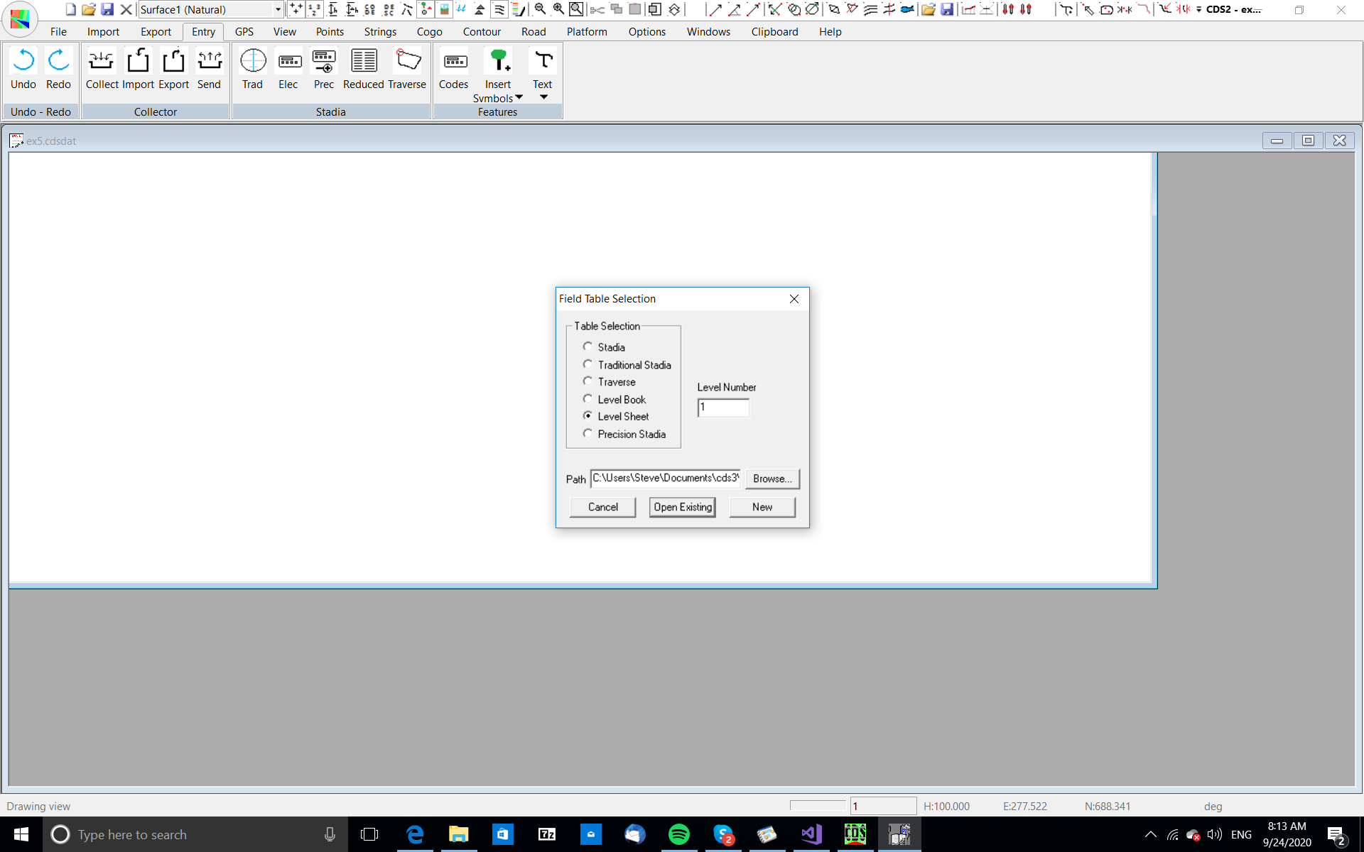 Click on CDS3 icon from desktop to start CDS. Pull down the File menu, select New. Make sure you are at the path “\Program Files\Foresoft\cds3\Tutor” and enter a JobID of ‘ex5’, and a description indicating it is data for 'Cross Sections from Level-Sheets'.