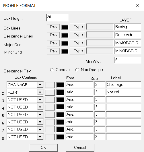 Your aim is to insert the labels “Chainage” in the field on the right of line 1, and “Natural Surface” in the label field on line 2 to make it appear identical to the screen above. If you are in an adventurous frame of mind, you may wish to play with the font settings, and choose a different font, colour and size, and we will leave it to you to discover the hours of fun which can be had trying different combinations. If you select the “Font” box between Chainage and the black square, the Font screen will appear and provide a gateway to your artistic leanings.