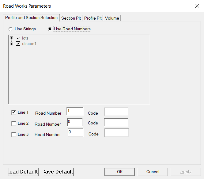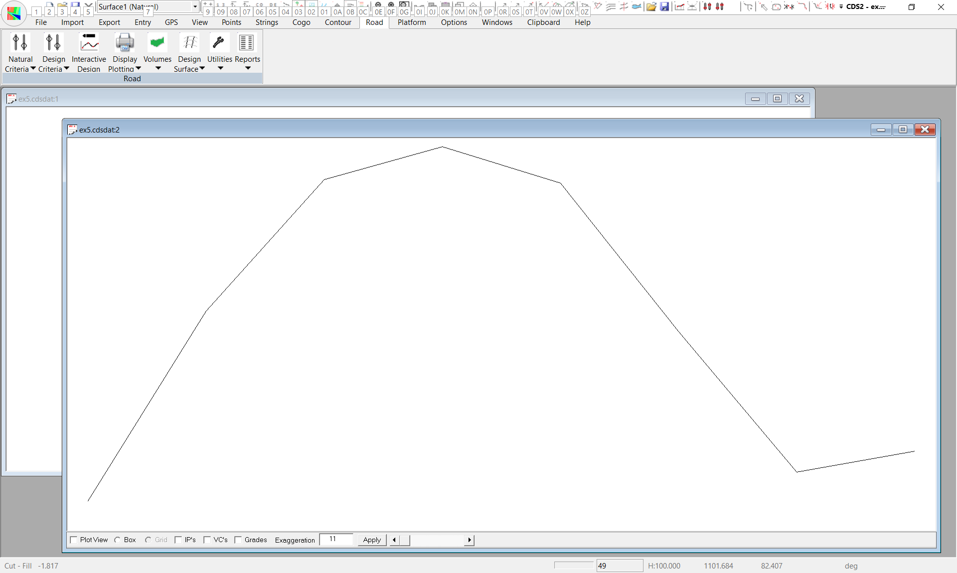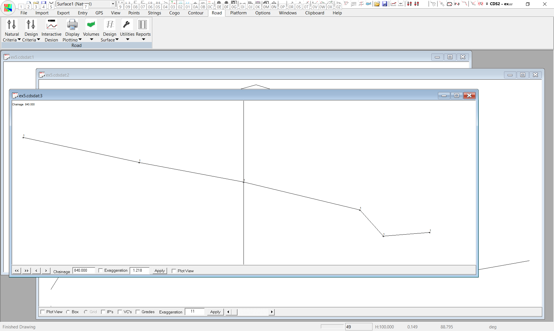 Until then, all we are really interested in is profiles and sections of the points, and these can be easily achieved with the values we have. Before going further we need to tell CDS that these points on road 1 are the points used when we wish to display profiles and sections. From Road -> Natural Criteria -> Profile Parameters - make sure that the radio button "Use Road Numbers" is active and that line1 is ticked and we are using a road number of 1. To display the profile pull down the Road Menu and select Display & Plotting. Select the Display Profile option and the screen should appear as below.