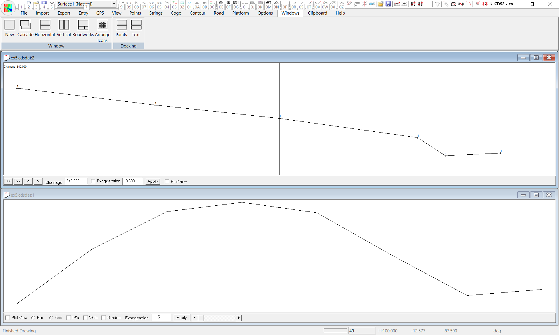 For example, if you wish to view the section at chainage 1160, simply select the Chainage box with you cursor, and then type in 1160 followed by the Enter key. At the moment you can see that you have three windows displayed on your screen, and these are titled Ex5:1 (the Plan View), EX5:2 (Profile) and EX5:3 (Section). In this case, we do not have nor need the plan view, so we can close the window titled EX5:1. Make this window active by clicking inside it, and then close it.