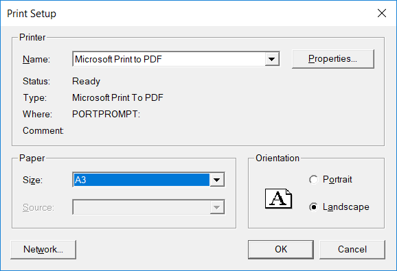 Pull down the File menu, and choose Print Setup. Now you need to pull down the list of installed printers and select your plotter. We have no idea what equipment you are likely to have installed. We will use the Microsoft Print to PDF printer driver. You will need to substitute whatever equipment you have connected to your particular computer.