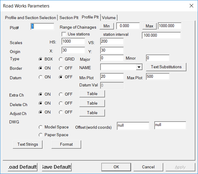 Next you need to access the Cross Section parameters, from the Road -> Display & Plotting -> Menu. Select the “Min” and “Max” in turn to insert the minimum and maximum chainage values into the relevant fields. Also click on the "Format" button and set the "offset limits". I changed them to -20 and 20.