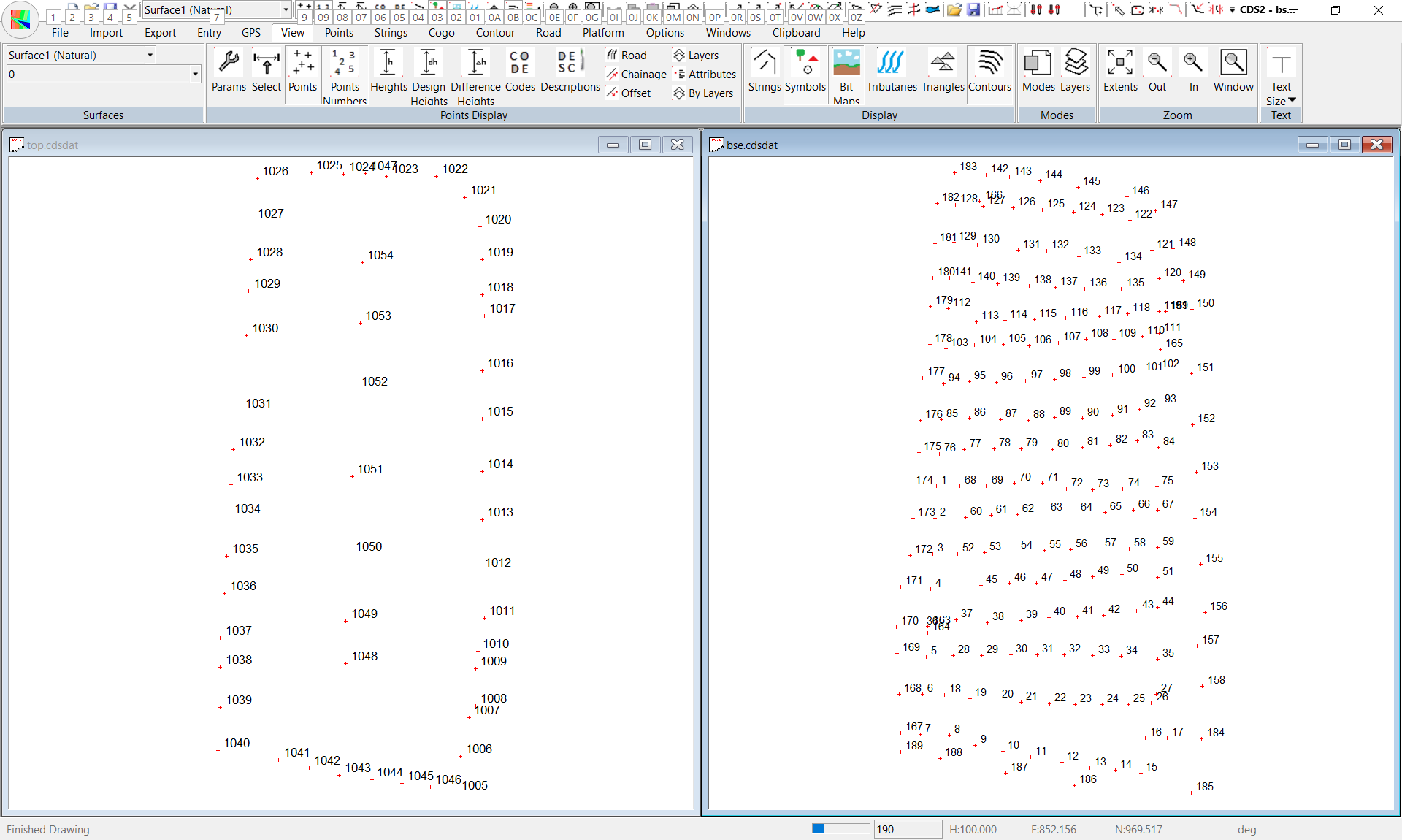 Your client has come to you and informed you that he will soon be having road construction materials delivered to his storage compound, and that he will need you to calculate the volume of material available from time to time. You have sent the field party out immediately, and they have picked up the area where the gravel will be stored, and this data is in job BSE supplied in the Foresoft\cds3\tutor folder. Once the gravel has been dumped, the field party returned to the compound and carried out a detail survey of the gravel heap. This information has been supplied in job TOP in the ‘Foresoft\cds3\tutor’ folder. Start CDS and use File Open ( or the Open Icon) to open Job bse in the Foresoft\cds3\tutor folder. Next, use the Open command again to open top, also in the ‘Foresoft\cds3\tutor’ folder. The screen should appear as below.