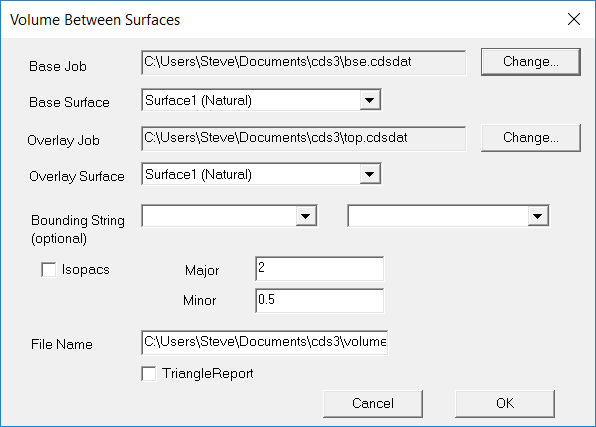 Here you need to specify the Job, and the Surface within that job to be used both as the base, and as the overlaid surface.Note that with regard to the “Surface” while it is possible to have a variety of different surfaces within the one job, at this stage of your learning curve we intend to concentrate on teaching you the processes required, and so we will restrict the examples to using a single surface in each job, so you need not be concerned with this field.