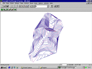 From here we ran the road routine to put these calculated design points back into the database. These points have design heights. We then triangulated and contoured this surface to check that our dam wall appears correct. We then created a new surface which we defined as a combined surface. Merging surface 1 as the base and surface 2 as the design leads to a new surface 3 which we have triangulated and contoured as a finished surface. The data can be downloaded from ftp//ftp.foresoft.com and download the file "FinishedDam.cab" file.