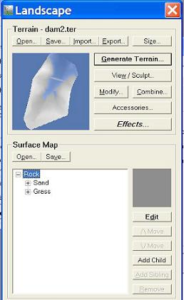 Now run the Terragen program. Make the Landscape dialog active. We now need to open up the ter file that represents the finished dam surface. Click on the "Open" button under Terrain and browse to the file that we have just created.In this example we are going to be a bit smarter in relation to vegetation and color etc. We are going to use a surface map to better define the rendered surface. Under surface map you can see the "Open" function. We are going to use one of the predefined surface maps. Click on open and browse to the Program Files\Terragen and you will see about 5 predefined surfaces. We chose the desert - sand and grass option. Please choose an option. Once you have gained some experience you can define your own surfaces. We suggest you experiment with there's first.