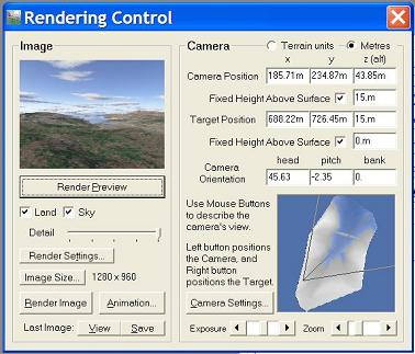 Click into the "Rendering" control to make it active. Our first job is to set the position of our camera and the position of where we are viewing to. This is done in the camera settings view. To move the view position hold the left mouse down and move it. To select the target hold down the right mouse and move it. We have decided to initially view the bottom end of the Island. The camera position can be seen in the view above as the 3 intersecting lines. The outer lines represent the edges of the view. We have also set the view position to be 30 metres high. About the deck height of a cruise liner.