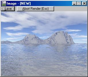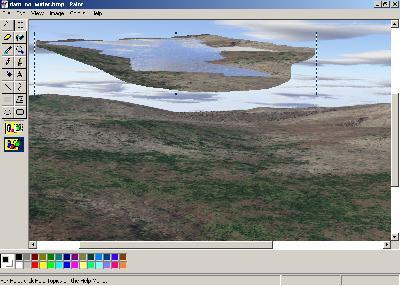 As mentioned before you can see the water extending to the other side of the dam wall. To fudge an acceptable result I used Paint. The procedure to be applied is as follows. Open up the above render in Paint.From paint select the free form section. You draw around the section to be selected. Then copy this selection to the clipboard. Open up the original render with out any water and then press "Paste". You can then position the cut out piece. When it is in the correct position press the escape key and it is locked in.