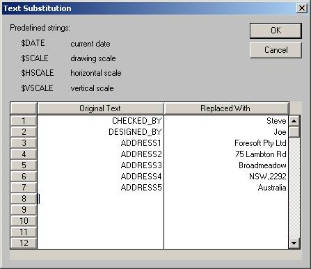 The next thing to observe on the "Plot Parameters" screen is the "Text Substitution" button. This brings up a table that you may fill in. The entries on the left are text strings found in the border dwg file while the corresponding right hand entry's are what the original text is replaced with. A dump of the table is seen below